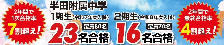 県下で最大の受験者を誇る全県模試(学悠出版)主催の「愛知県中高一貫校チャレンジ模試」を山王学院で開催します。山王学院から半田附属中に2025年度は23名、2026年度は16名が合格しました。合格率は、2年間で1次選抜が7割超え、最終選抜が4割超え。