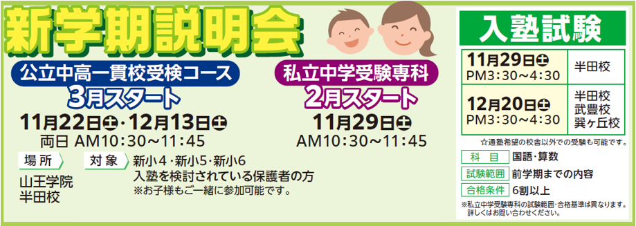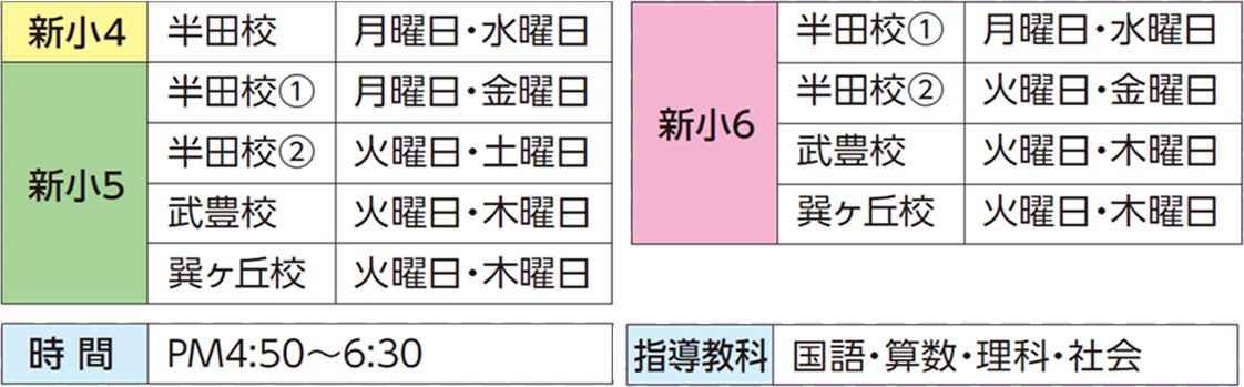 | 時間 | 【半田校・武豊校】 PM5:00~6:40 【巽ヶ丘校 】 PM5:20~7:00(火曜日) PM5:00~6:40(土曜日) |