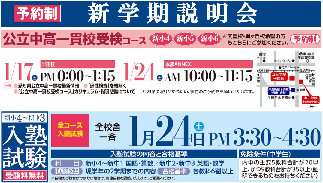 また、明和高等学校附属中学校における1次選抜(適性検査)については、仮設校舎におけるトイレの混雑を予想し、第1時限(適性検査1)と第2時限(適性検査2)の間の休み時間を15分延長し、第2時限を15分遅らせて行う旨、12/19に発表がありました。(条件の公平を期するため、第2会場の愛知総合工科高校でも同様に行います。)