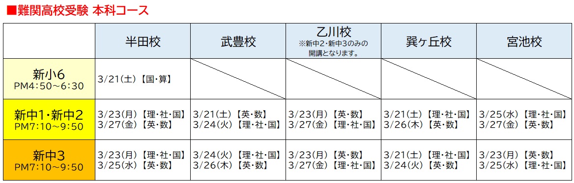 ※新小6は半田校のみで開講、乙川校は新中2・新中3のみの開講となります。