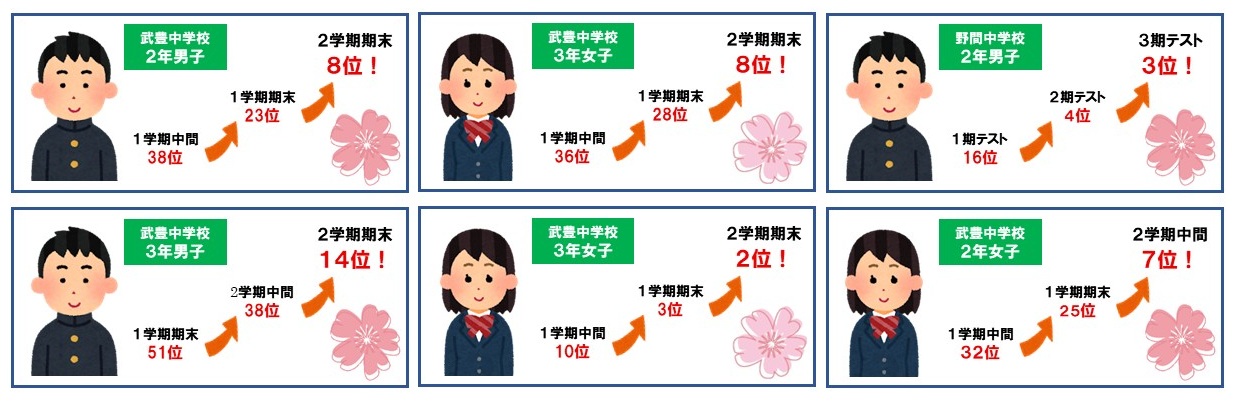 ①は基礎固めに有効であり、②はレベルアップに非常に有効な手段です。特に②は「できない」を「できる」にすることの連続で、その結果、2学期期末テストでトップ10入りを果たしたのです!(模試の偏差値も徐々に上がっています!)
