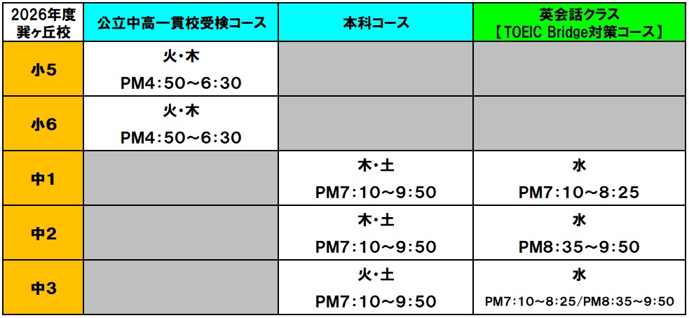 巽ヶ丘校には中学校では阿久比中・西部中・東部中・加木屋中、小学校では英比小・卯ノ里小・草木小・東部小・南部小・新田小と複数の小中学校から多数の生徒たちが通塾しています。また、中学生英会話コース【TOEIC Bridge対策コース】の開講校です。